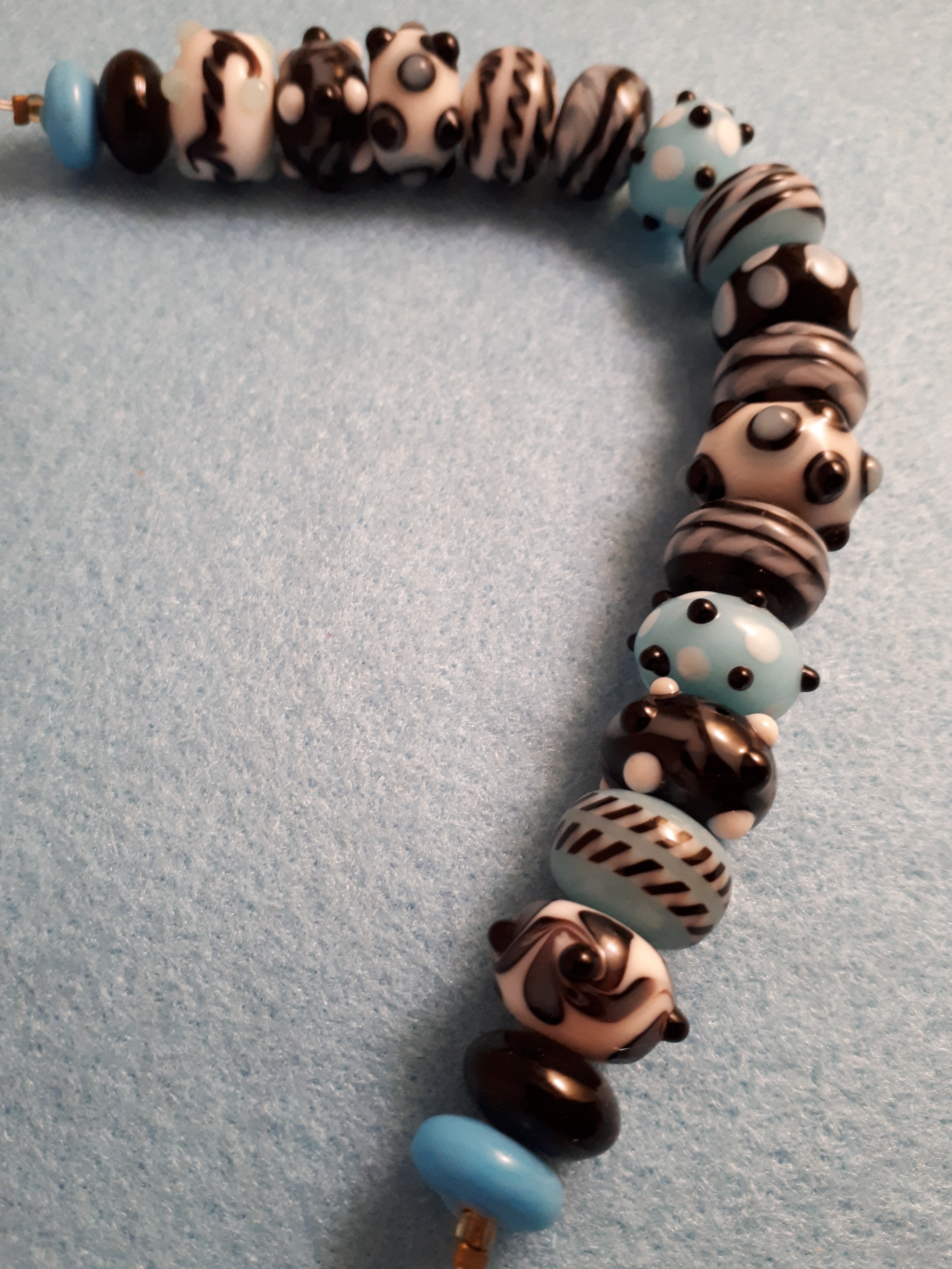 prachtige handgeblazen, kralen, in de tinten zwart, wit en hemelsblauw. 15 bewerkte kralen, 4 bijpassende kleine rondellen.