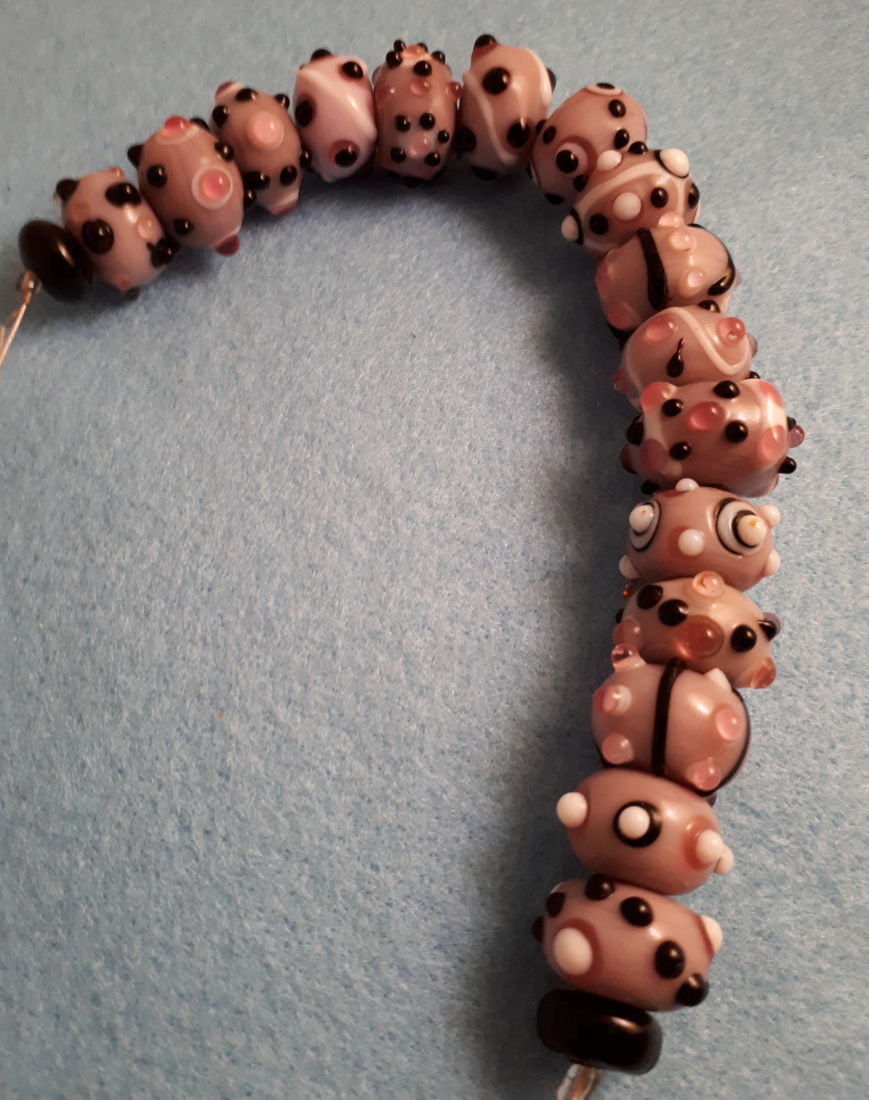 Prachtige handgemaakte glaskralen, hoofdkleur (grijs)lila-roze kleur met zwart en wit. Per streng 15 bewerkte kralen en twee zwarte afsluitende rondellen.