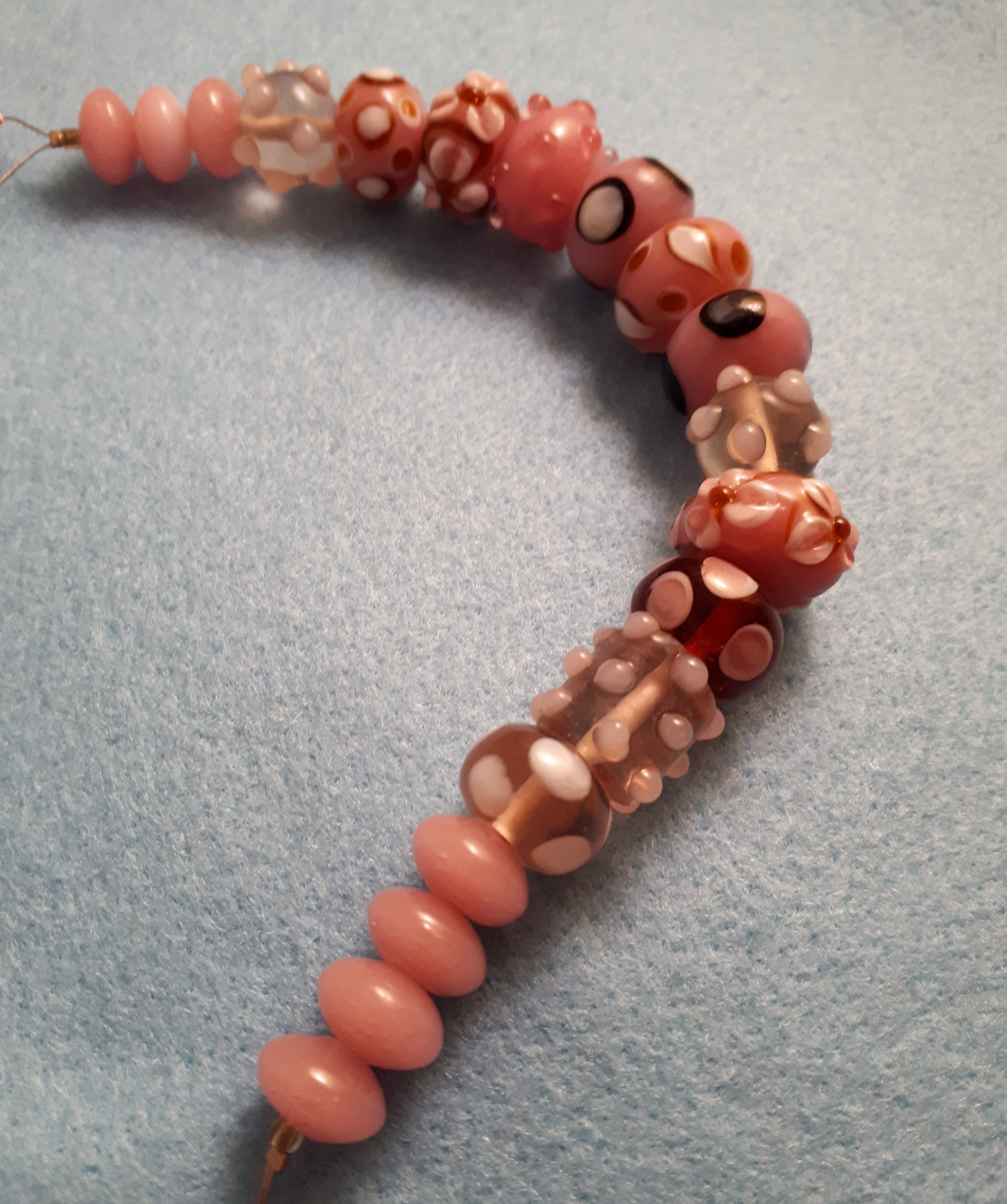 Prachtige handgemaakte glaskralen, roze en doorschijnende kralen met zwarte en witte accenten, per streng van 12 bewerkte kralen en 6 roze rondellen.