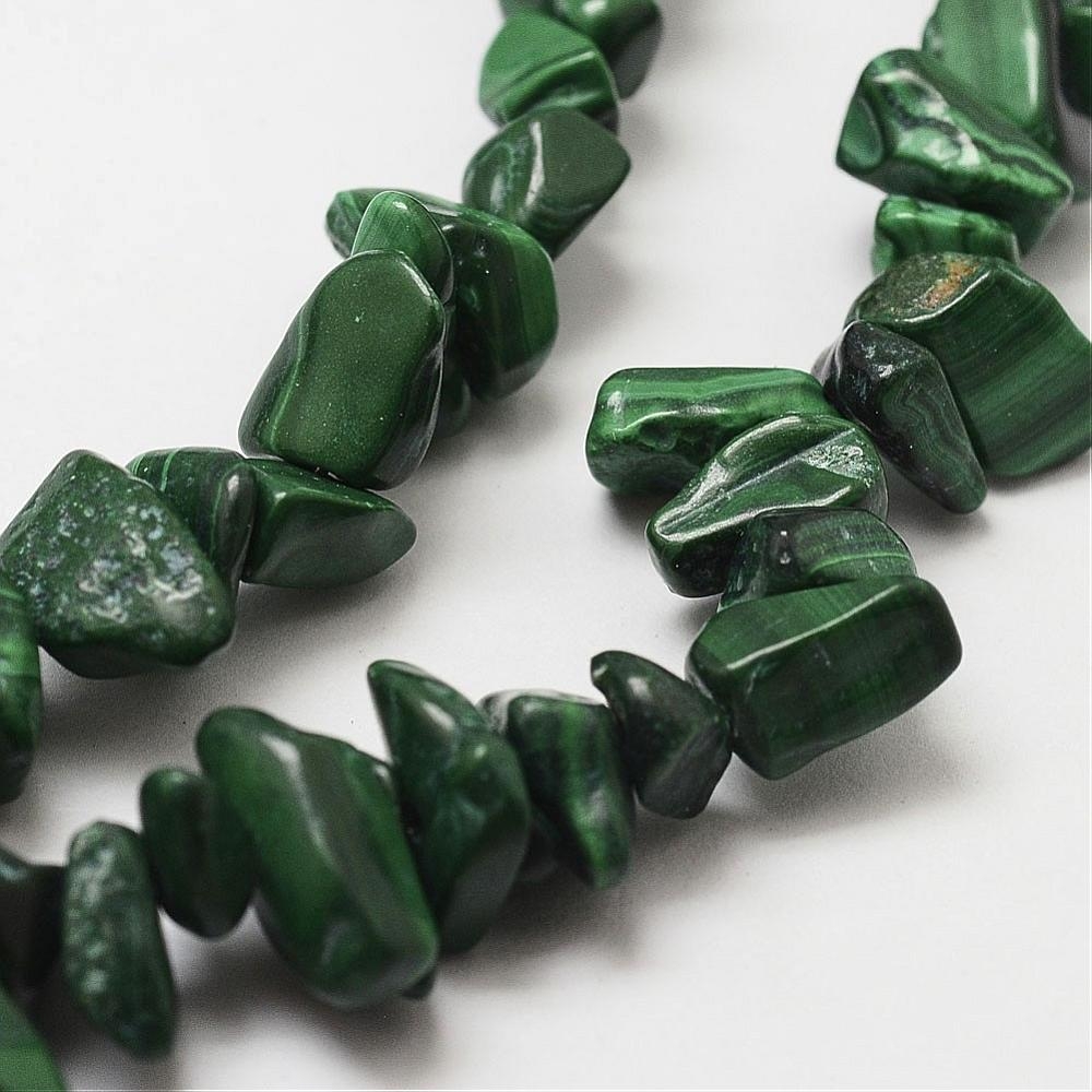 Deze strengen zijn van natuurlijk malachiet, Natuursteen heeft af en toe onregelmatigheden, maar dat geeft juist ook de mooie natuurlijke look. De breedte van de chips ligt tussen 3 en 5 mm, de lengte tussen de 7 en 13, de hoogte is ong.