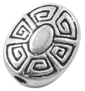 Tibetaans zilveren kraal, plat ovaal. De kraal is 11mm lang, 9mm breed en heeft een dikte van 4mm.