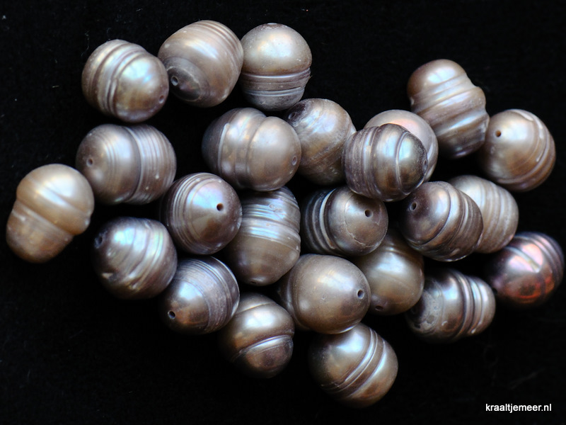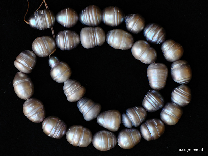 Graad "B" Rice-vormige parelstrengen, geverfd De parels zijn: 11~12mmbreed, 11~15mm lang, Het rijggat is: 1mm. Een streng is 38cm en op een streg zitten ong 28 parels.