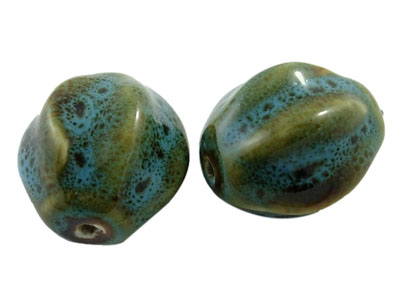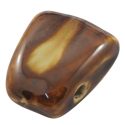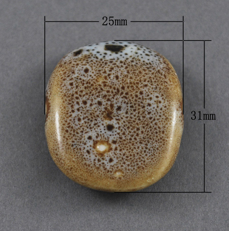 Handgemaakte porseleinen kraal in prachtige bruintinten, kalssieke uitstralen en galnzend uitgevoerd. Maat: 31mm lang, 26mm breed en een gatgrootte van 4mm.