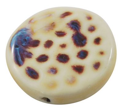 Handgemaakte porseleinen kraal, antieke uitstraling, glanzend porselein. Wit met bruin en blauw.