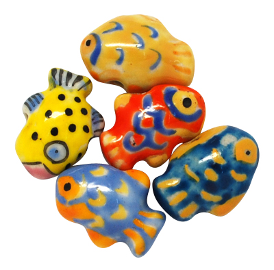 Porseleinen kraal, mooi fel gekleurde vis, gemixt assortiment, maat: 18-19mm lang 13-14mmm breed.
