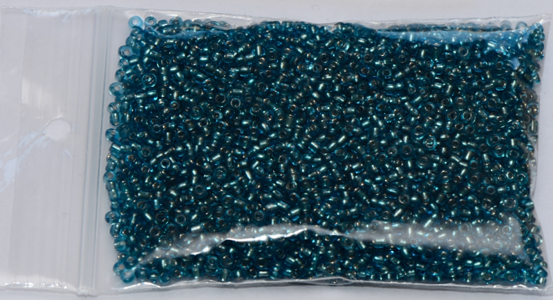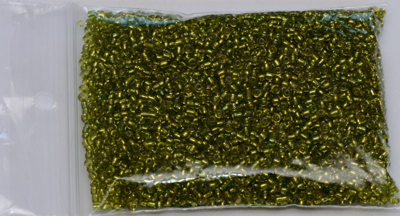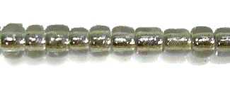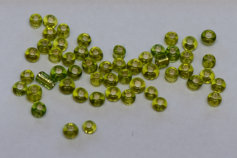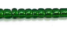 Transparant groene rocailles met een zilverkleurige kern. verpakt in zakjes van 50 gram.